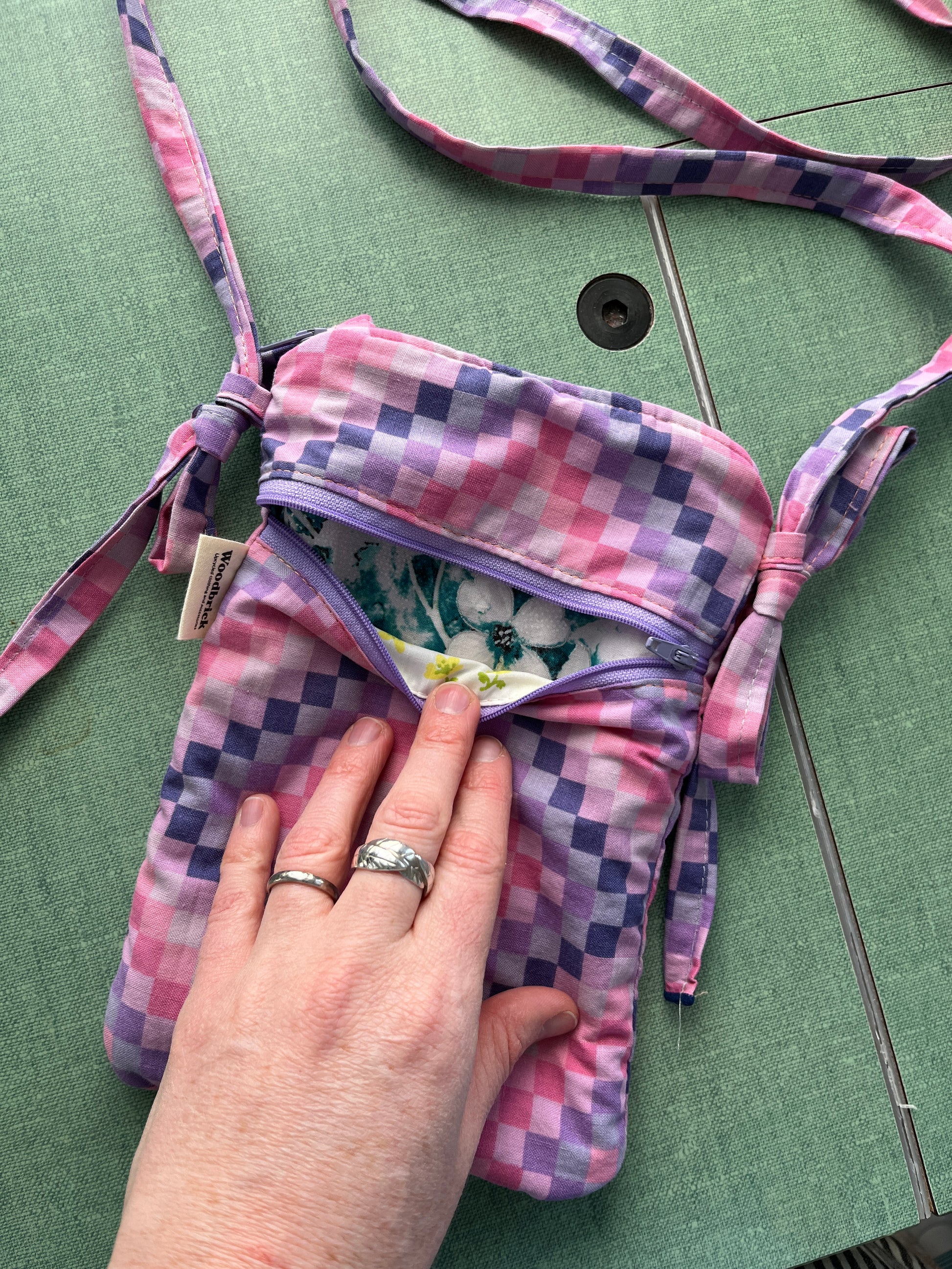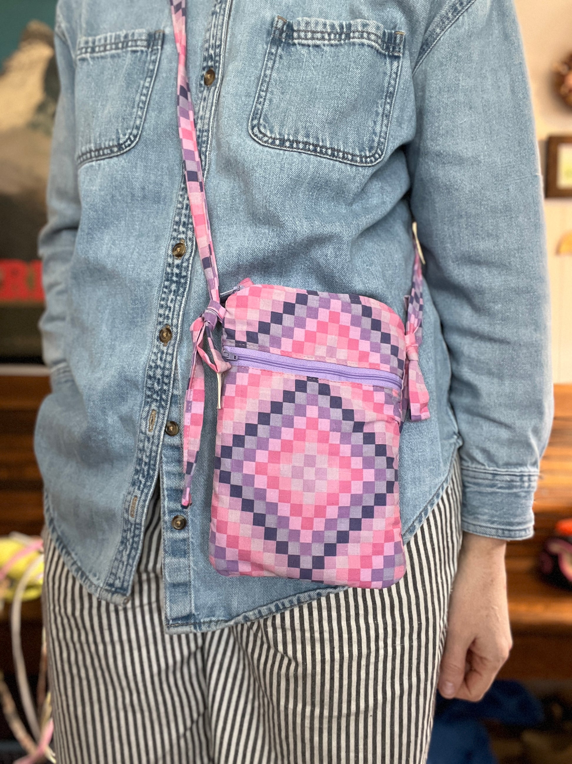 Made from reclaimed fabrics, this slim crossbody pouch gives materials a second life while keeping your essentials close at hand. Featuring a secure zippered top and outside pocket, and adjustable fabric strap through unique loop and tie design. A lightweight crossbody bag, it’s perfect for daily errands, travel, or hands-free adventures. Adjust it shorter for smaller bodies or kids, or extend bow ties for longer length