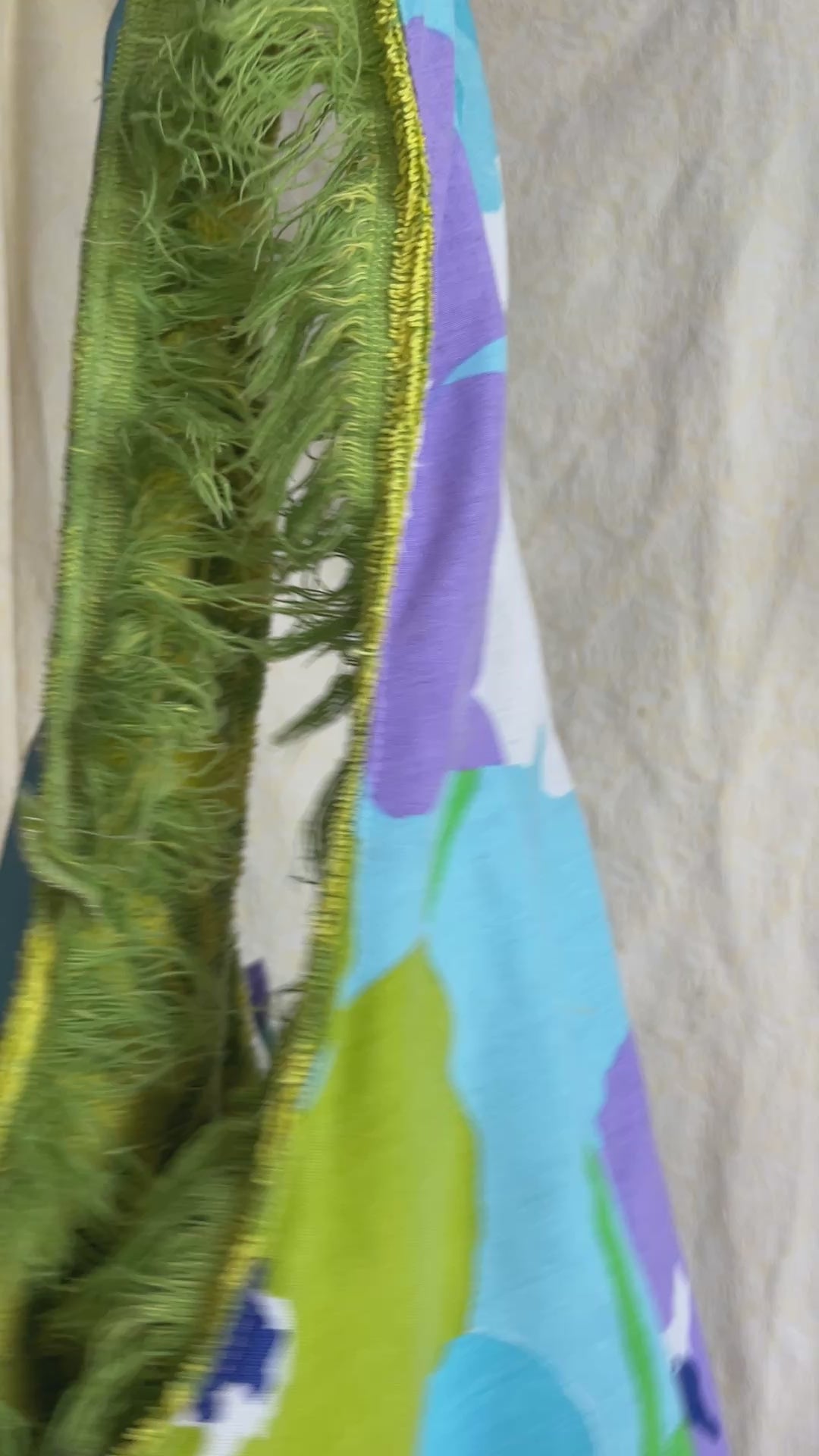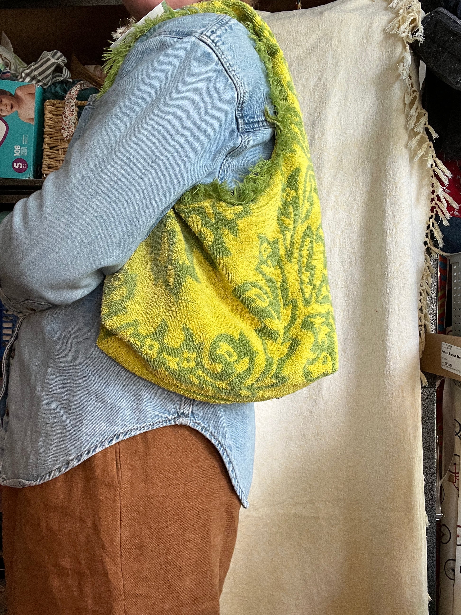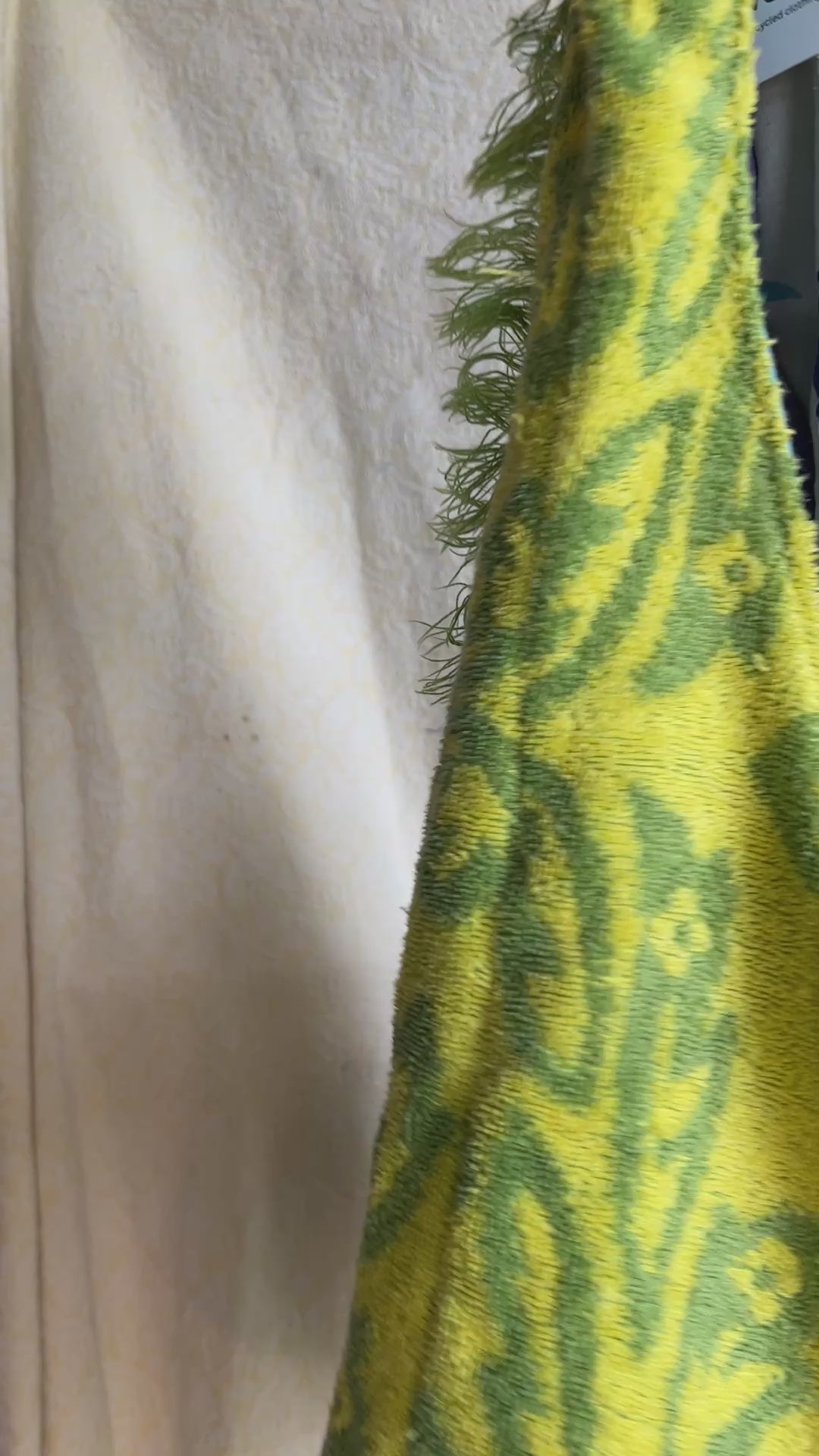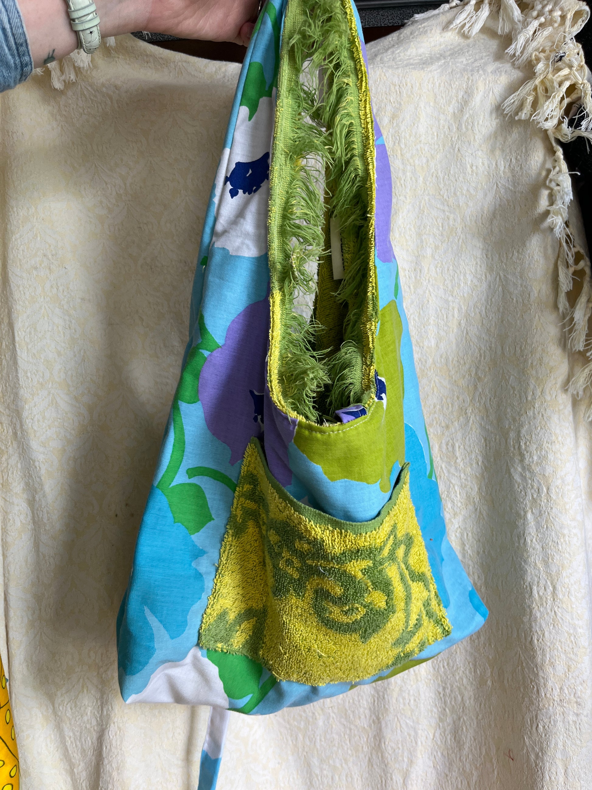 Soft vintage towel with salvaged fringe, large print vintage floral sheet reverse.