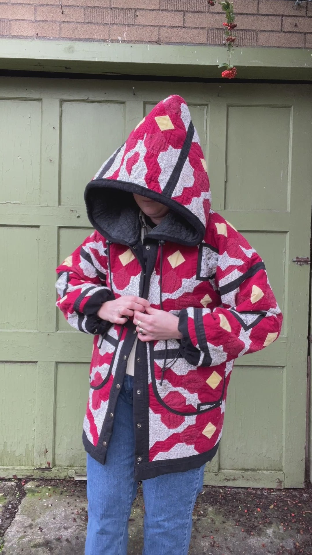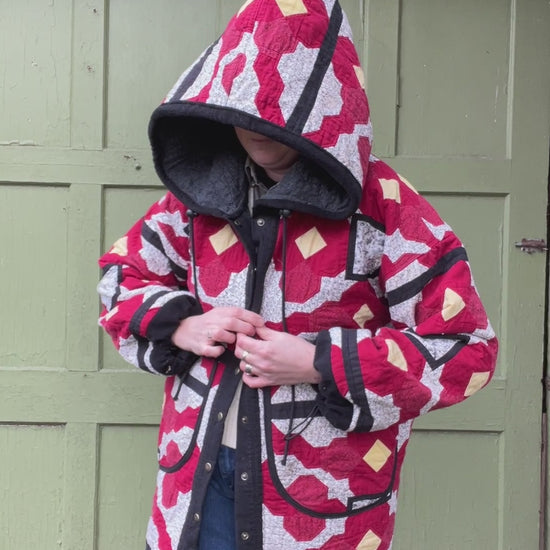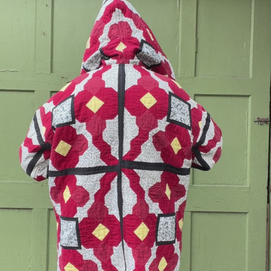 A long hooded coat with adjustable balloon sleeves. High drama, high volume hood with functioning cinches. Crafted from an heirloom hexagon quilt in red, black and yellow - geometric poppies.