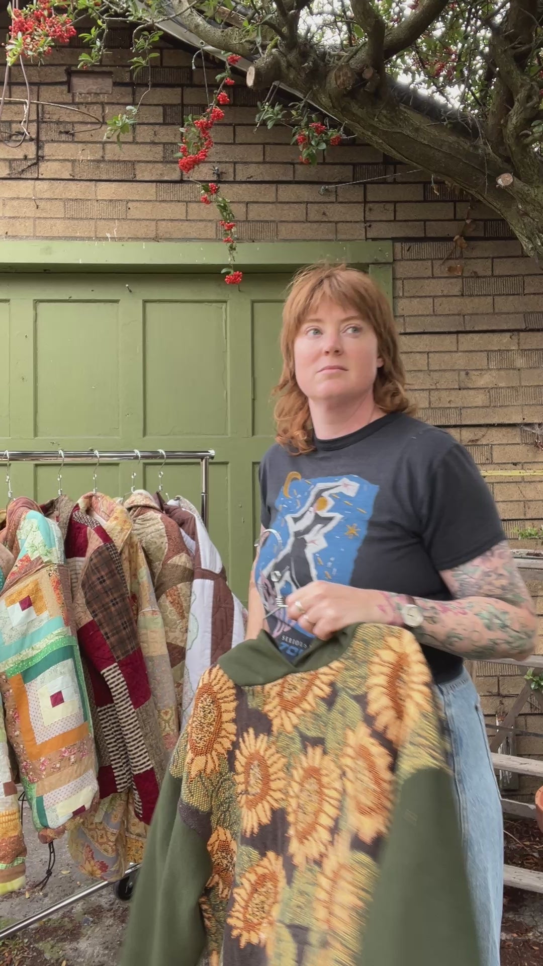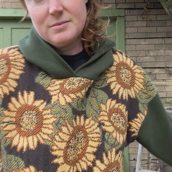 Heavyweight woven sunflower blanket with original fringe hem! New, secondhand fleece hood and sleeves. Dropped shoulders and oversized fit makes for flexible sizing - medium to Xl.