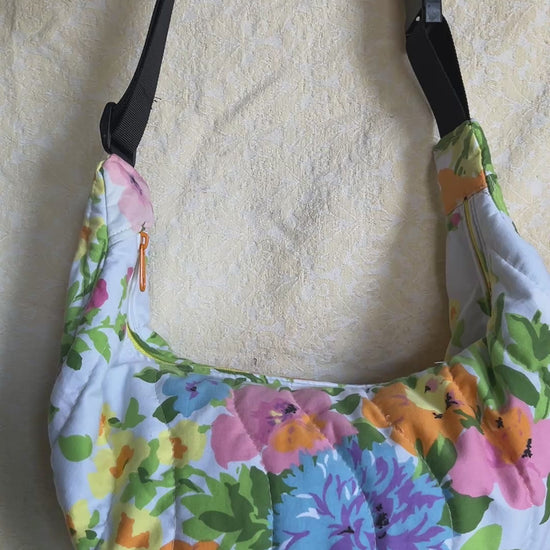 Squishy and quilted vintage bedsheet with a grosgrain ribbon ruffle and high contrast black nylon strap with buckle.