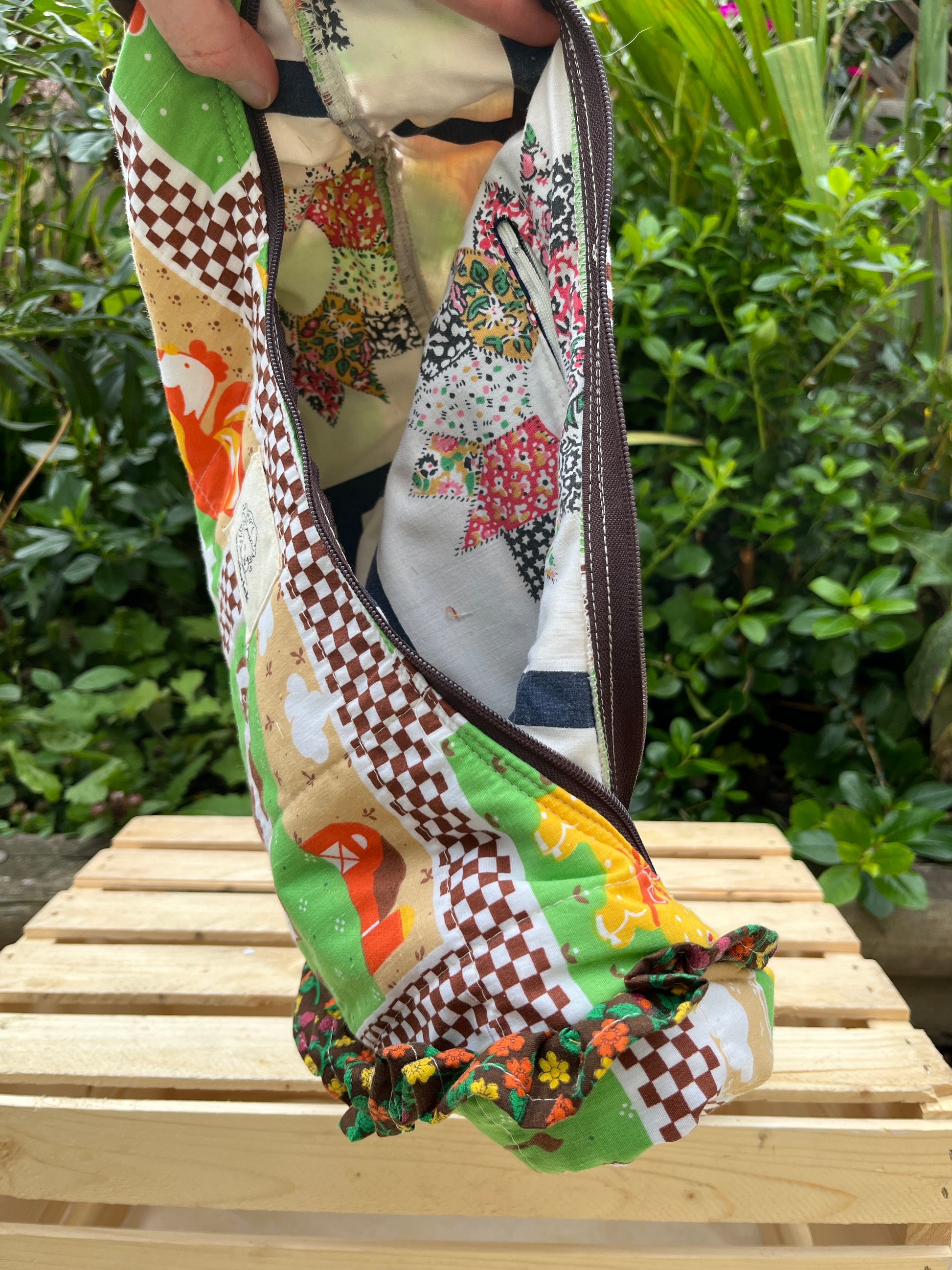 Whimsical vintage print, quilted by me with added vintage cotton print ruffle. Brown strap. Larger of two matching bags.