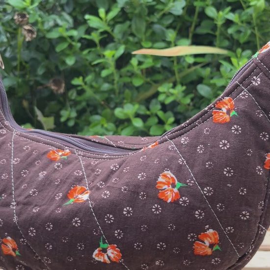 Vintage orange carnation and brown cotton print. Quilted by me, with brown strap. Larger of two matching bags.