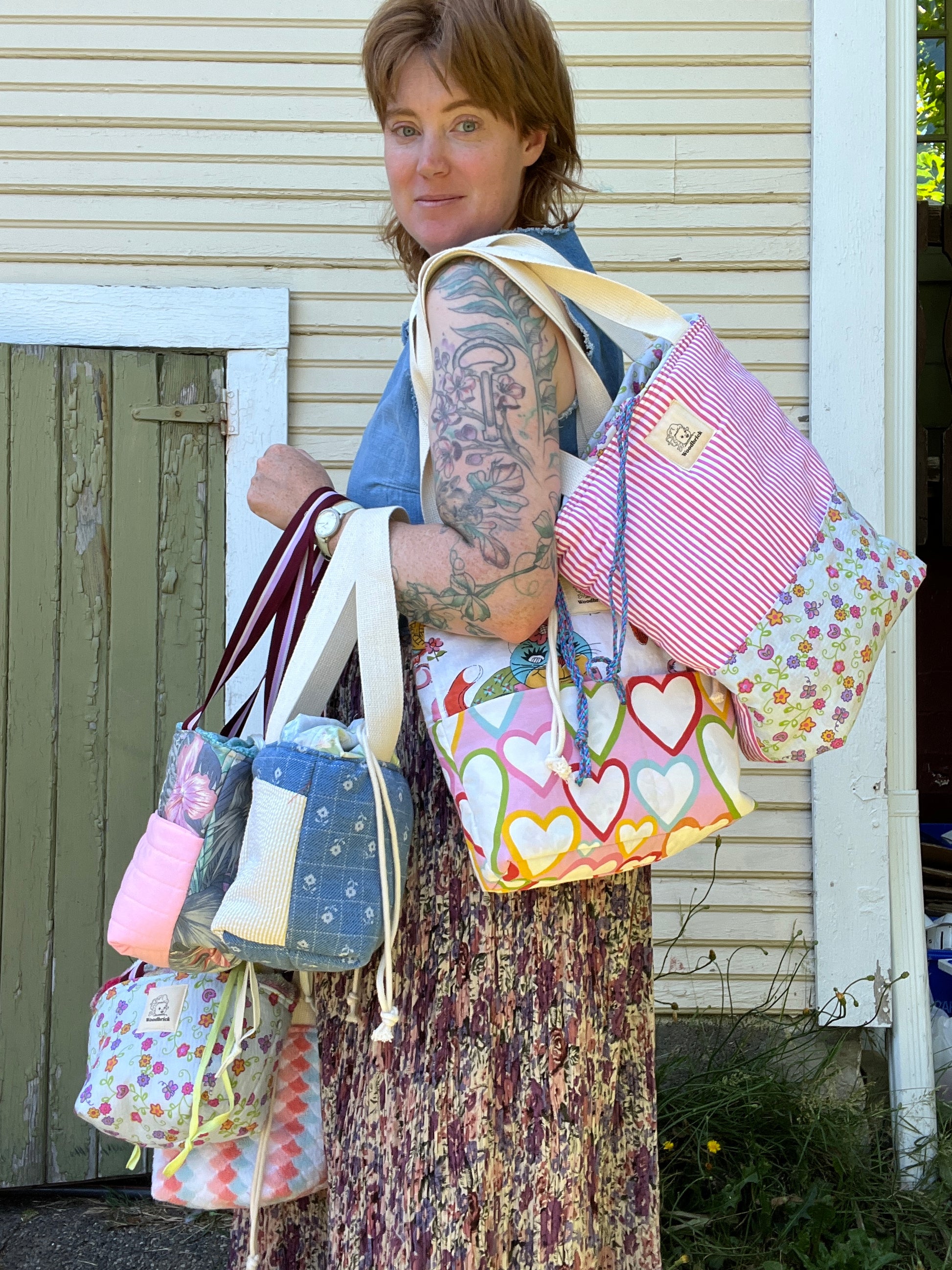 Each bag is handmade from repurposed and vintage textiles, giving new life to colourful prints and soft summer textures. Inside, you'll find thoughtfully placed pockets to help your small items stay tidy and easy to reach. Lightweight yet study, the cotton webbing strap makes it easy to toss over your shoulder or tuck into a larger tote. The drawstring closure keeps everything secure while offering quick access on the go.