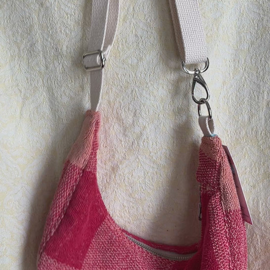 Towel turned crescent bag, this small size crescent has a chameleon colour scheme that can be anywhere from red to pink in different lighting.