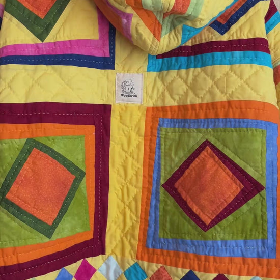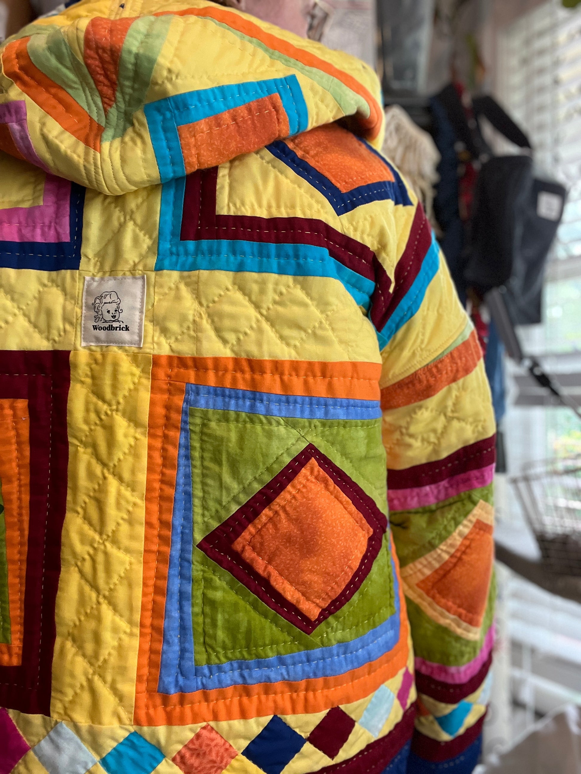 Best of both worlds: a modern, saturated colour block quilt with hand stitched top quilting. Finished with vintage floral binding. Be bold and wear a piece of art! Plus, hood ;)