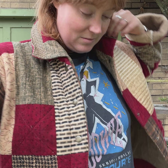 Textiles are sourced secondhand and have been made, used and loved before taking on new life as jackets. While materials have been carefully sourced and vetted for quality, signs of fabric age, wear and stains are possible throughout the finished garment. This is an evident fact of upcycling and adds to the character of finished items. Please consider this carefully before purchasing items as no returns are accepted.