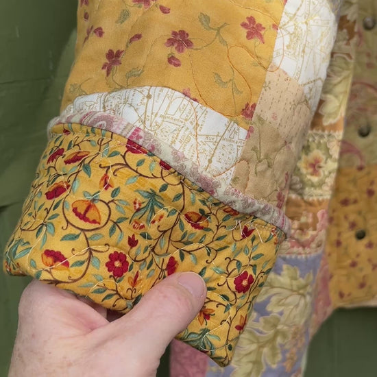 Quilt jackets should be treated with care and washed in garment bags or on delicate cycles to preserve snap closures and vintage quilting. Hang to dry.