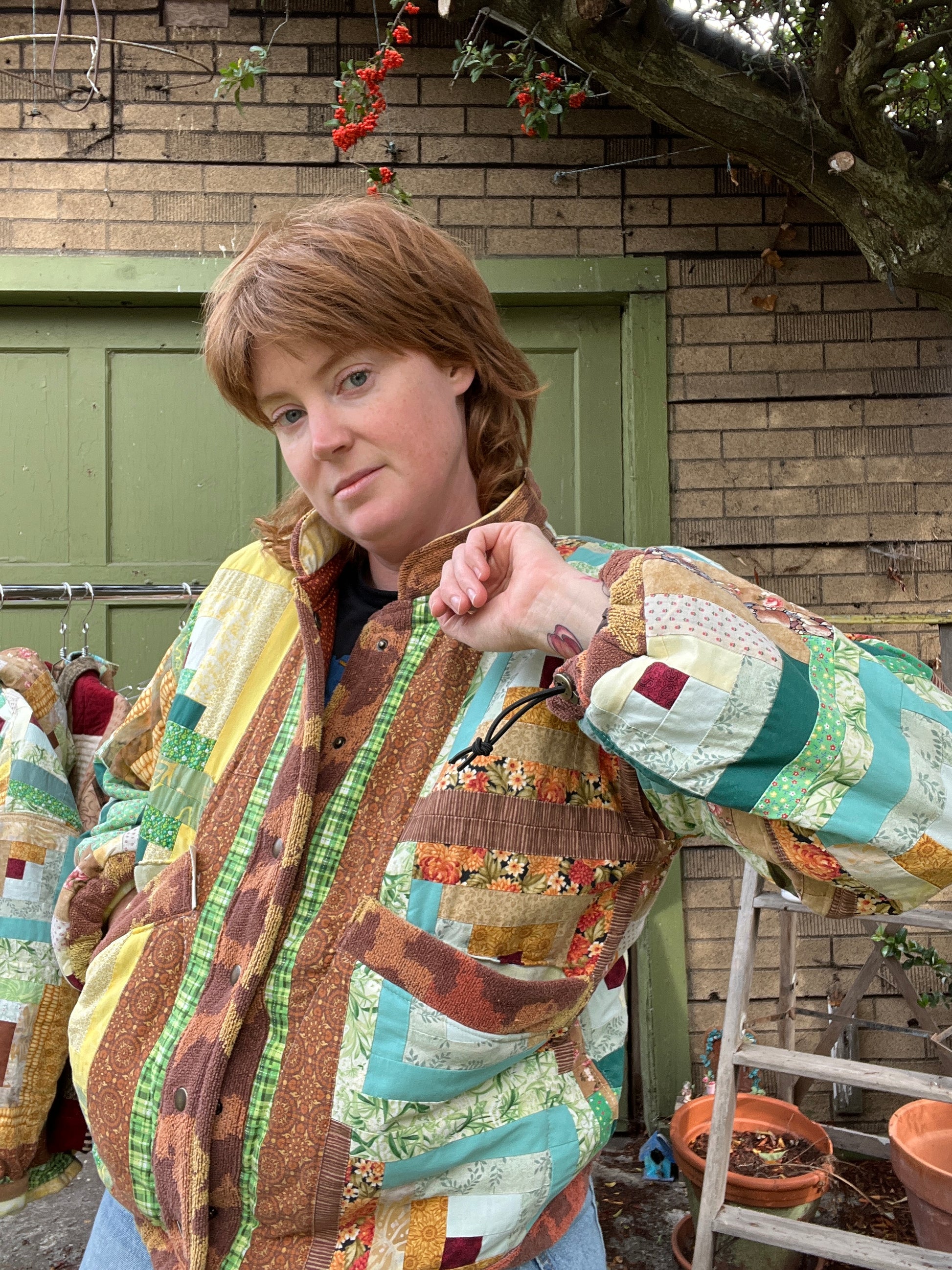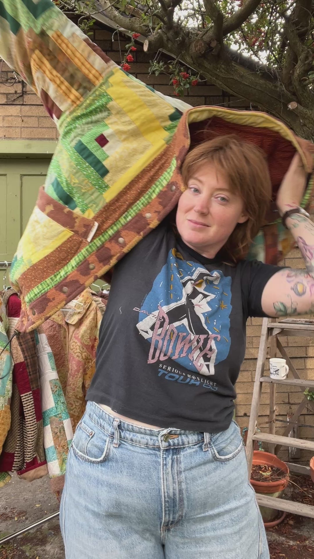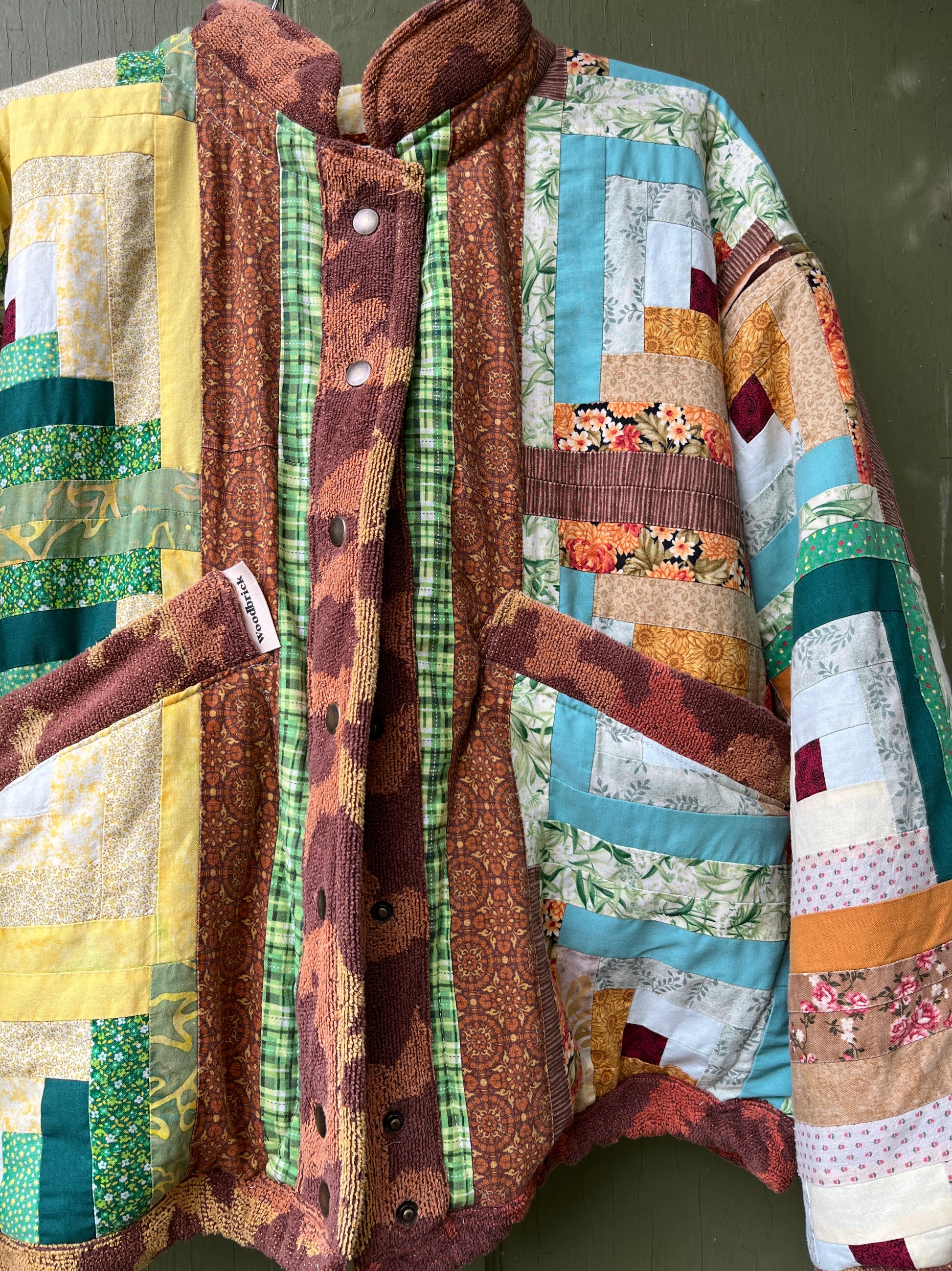 A large and carefully pieced patchwork quilt top in harvest colours from green to brown. Layered with an inner quilt and cotton jacket lining. Finished with a vintage towel for facing, pockets, hems and cuffs. Inner pockets for added warmth, and adjustable hems for layering and coziness. This is a heavy jacket and will work hard for years to come.