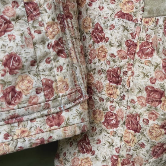Quilt jackets should be treated with care and washed in garment bags or on delicate cycles to preserve snap closures and vintage quilting. Hang to dry.