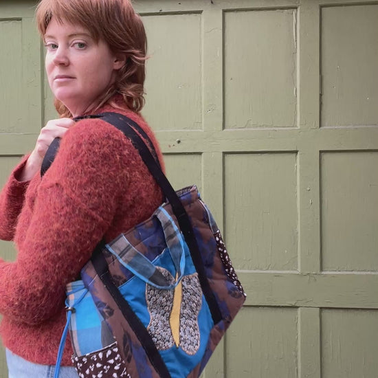 Modern blue and brown woven chevrons, plaid scraps, vintage cherry print and butterfly applique from Moonlite Vintage. Added royal blue drawstring to create a cinched bag top, or keep loose for added aesthetic.
