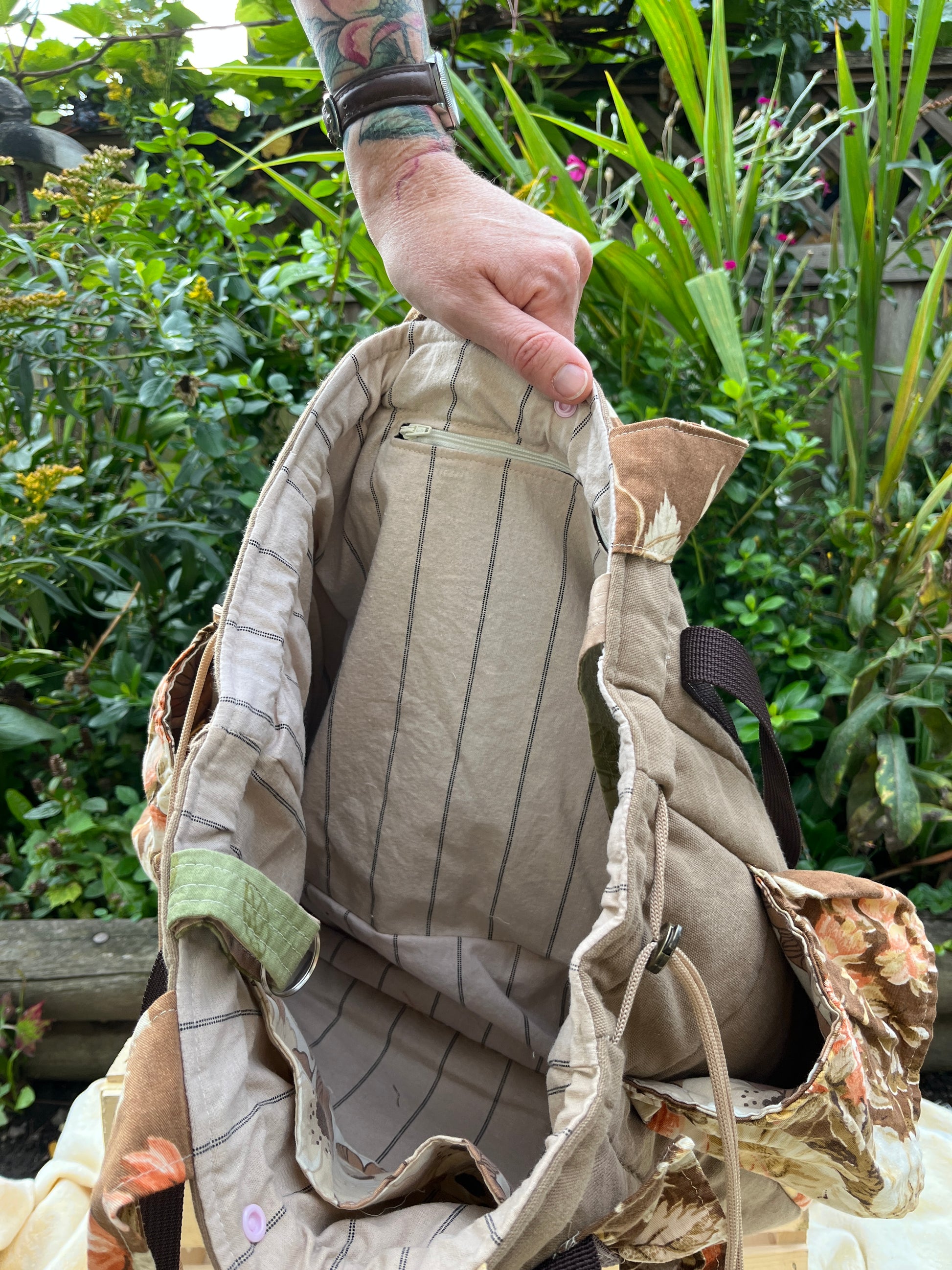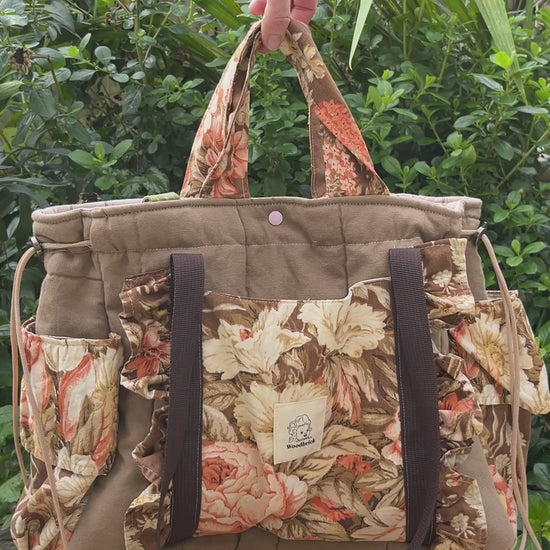 Neutral quilted base bag, repurposed decorative pillow sham in coral and neutral floral including salvage ruffle. Added drawstring for optional cinched bag top.